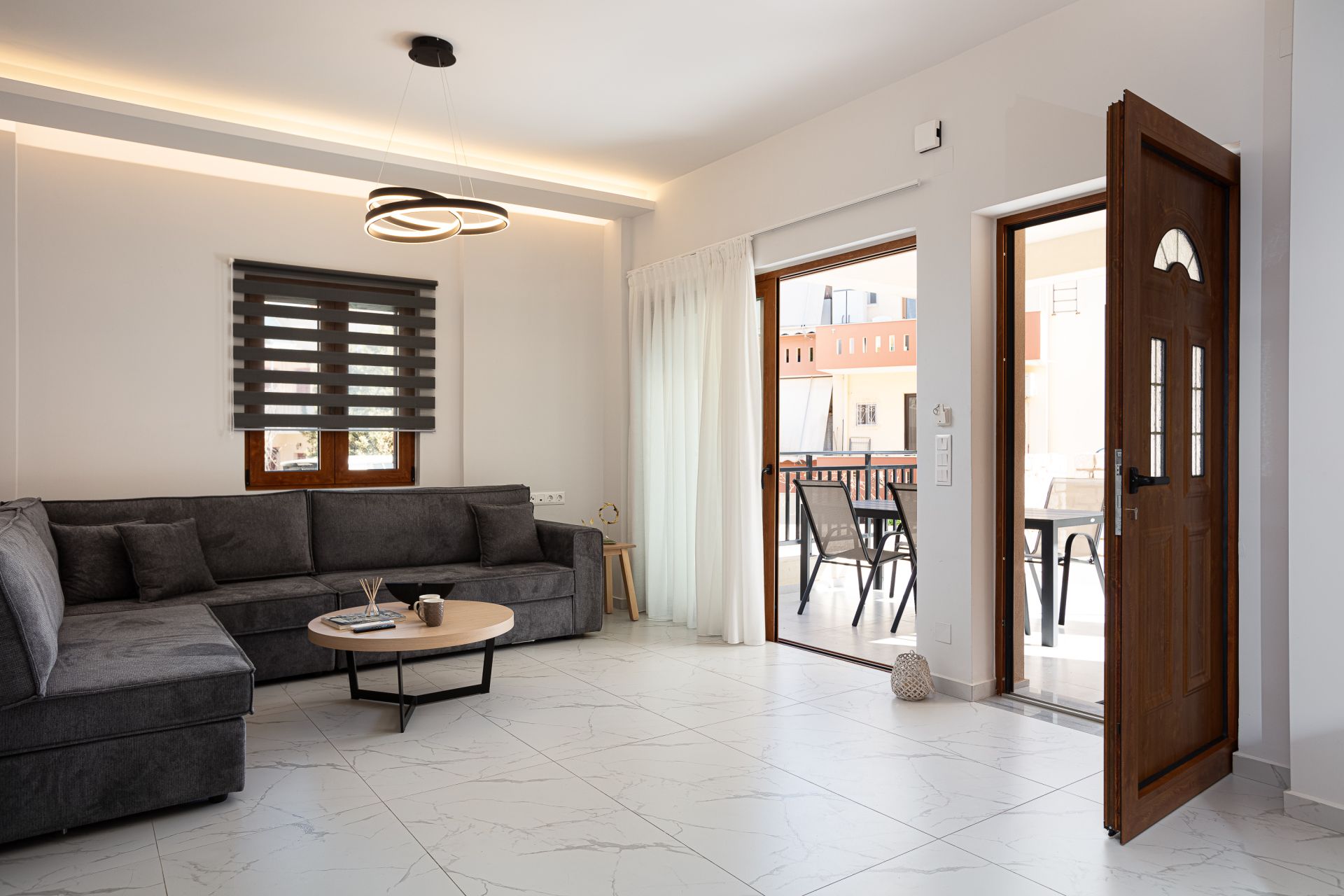 Ο κεντρικός κοινόχρηστος χώρος της κάθε βίλας στις PROVILLAS έχει σχεδιαστεί για να προσφέρει ζεστασιά, λειτουργικότητα και άνεση. Περιλαμβάνει έναν ευρύχωρο και φωτεινό καθιστικό με έναν μεγάλο, άνετο καναπέ ιδανικό για στιγμές χαλάρωσης, καθώς και μια smart τηλεόραση τελευταίας τεχνολογίας για ταινίες ή μουσική. Διακριτικές διακοσμητικές λεπτομέρειες συμπληρώνουν την ατμόσφαιρα με στυλ.